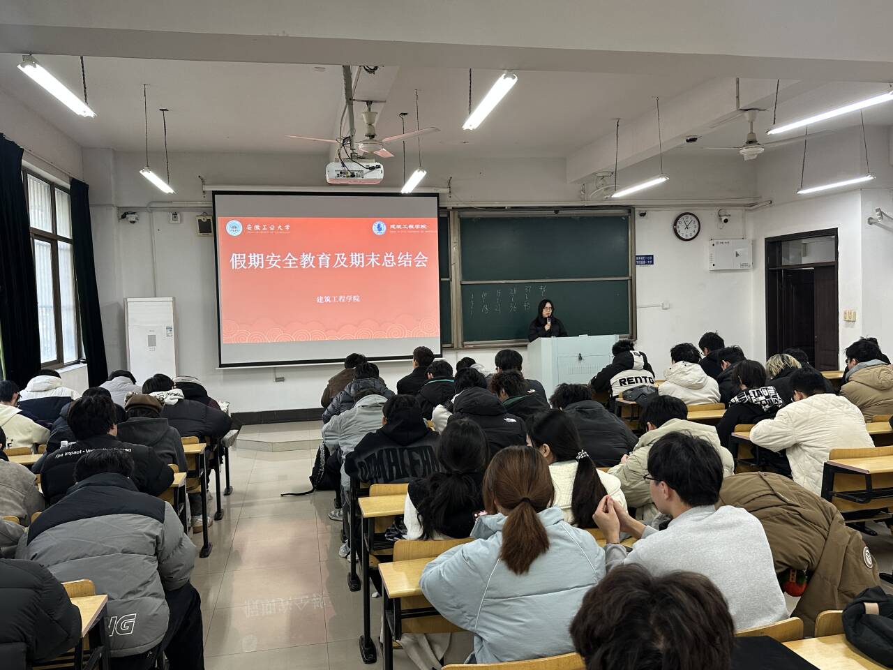 2023级于建北505教室召开寒假安全教育年级会。会议由2023级辅导员主持,2023级全体同学参会。