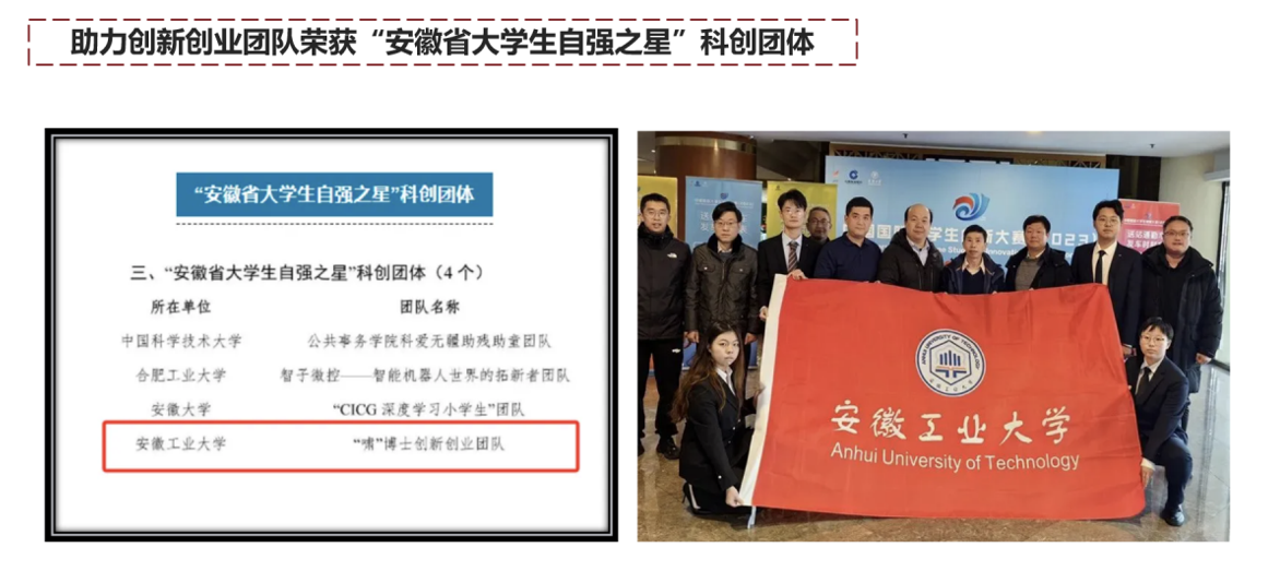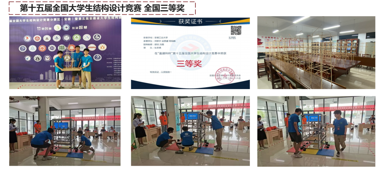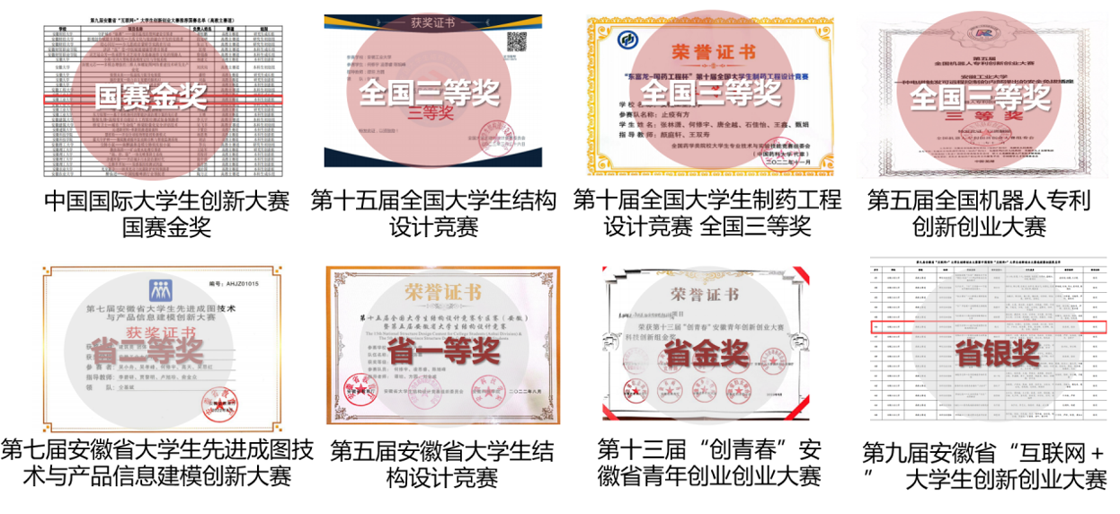 建校以来在该赛事的最好成绩)、“第十五届全国大学生结构设计竞赛”全国三等奖、 “第十届全国大学生制药工程设计竞赛”全国三等奖、“第五届全国机器人专利创新创业大赛”全国三等奖、“第九届安徽省互联网+大赛”安徽省金奖”、“第五届安徽省结构设计竞赛”安徽省一等奖、“第六届安徽省大学生先进成图技术与产品信息建模创新大赛”安徽省三等奖、“第七届安徽省大学生先进成图技术与产品信息建模创新大赛”安徽省三等奖、第十一届华东区大学生CAD应用技能竞赛 华东区三等奖的优异成绩。