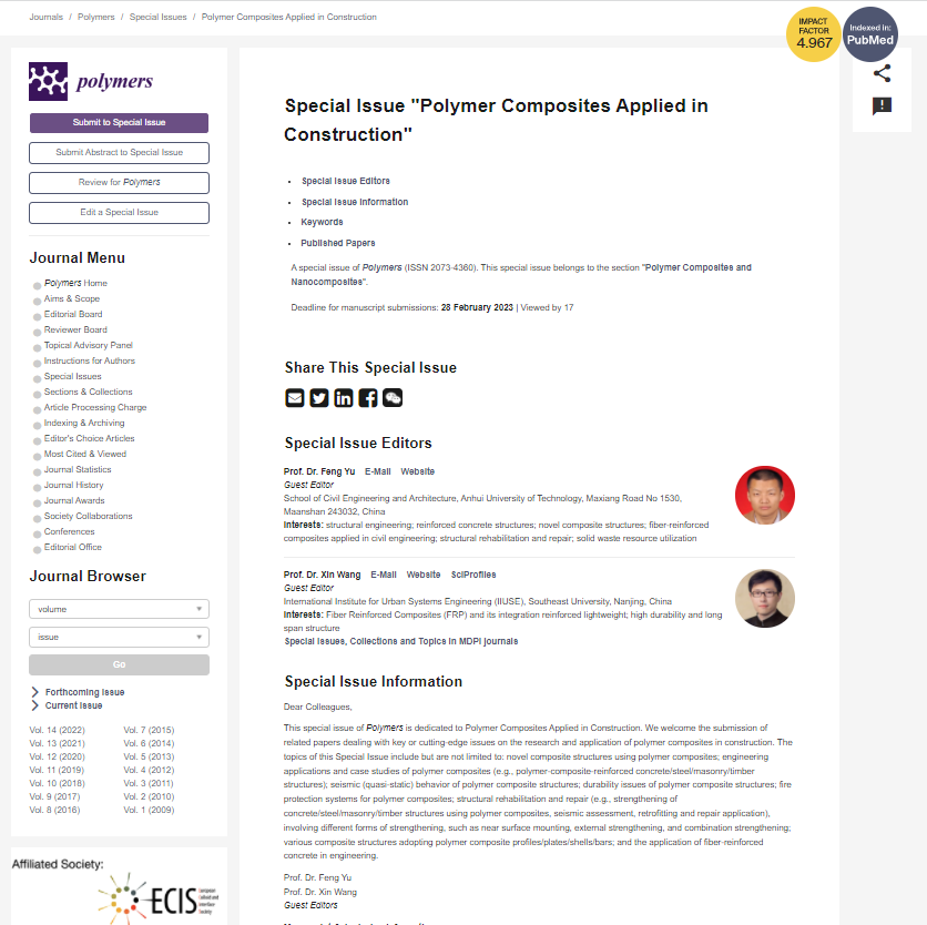 于峰教授发出邀请函,聘请其担任《Polymer Composites Applied in Construction》特刊客座编辑(Guest Editor)。