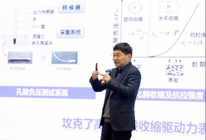 在首场报告中,刘加平院士围绕“现代混凝土研究与理论”进行了深入的讲解。他详细介绍了现代混凝土在力学性能、耐久性与可持续发展方面的最新研究成果与理论进展。从材料组成、微观结构到宏观性能,刘加平院士系统地梳理了现代混凝土的研究热点,并分享了高性能混凝土、自修复混凝土和绿色低碳混凝土的开发与应用实例。通过理论模型与实验数据的结合,分析了不同工况下混凝土的行为特征,并阐述了多尺度分析、先进测试技术及数值模拟在现代混凝土研究中的重要作用。刘加平院士的报告不仅展示了前沿的科研成果,还为混凝土材料的未来发展指明了方向,对建筑行业可持续发展具有重要意义。