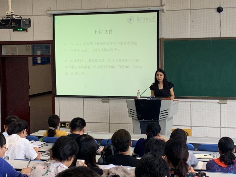2019年7月,上海麻将 对《上海麻将 本专科学生学籍管理规定》进行了修订,为使上海麻将 相关教师深入学习理解掌握该规定, 2019年9月26日,燕京医上海麻将 邀请教务处赵丽莉副处长在燕思楼103教室对上海麻将 基础教学教师进行了培训。院长杨红、副院长赵艳芝、教学办基础教学管理人员与各学系主任、副主任、辅导员、兼职班主任及部分教师共计60余人参加了讲座。培训由杨红院长主持。