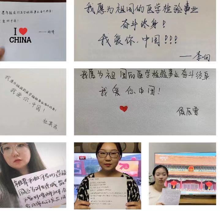2019级医学检验技术专业和卫生检验与检疫专业的师生们在观看70周年庆典活动直播的过程中,纷纷通过学系国庆盛典观感群发起表白祖国的活动,一张张和国庆盛典合影的自拍,尽显首医燕院莘莘学子的青春之志,爱国之情!师生们通过微信群表示祝福的同时,感慨到看着阅兵式上的官兵们雄赳赳气昂昂、英姿飒爽的样子使人们倍感精神振奋、非常自豪,有这样的军队、有这样的官兵作为一名中国人我非常骄傲。学系魏秋芬老师作为北京市顺义区民主联盟副主委受邀参与了现场观礼活动,魏老师说道“此生能够作为观礼嘉宾,见证建国七十周年盛典,无比荣耀!祝愿祖国更加繁荣昌盛!”