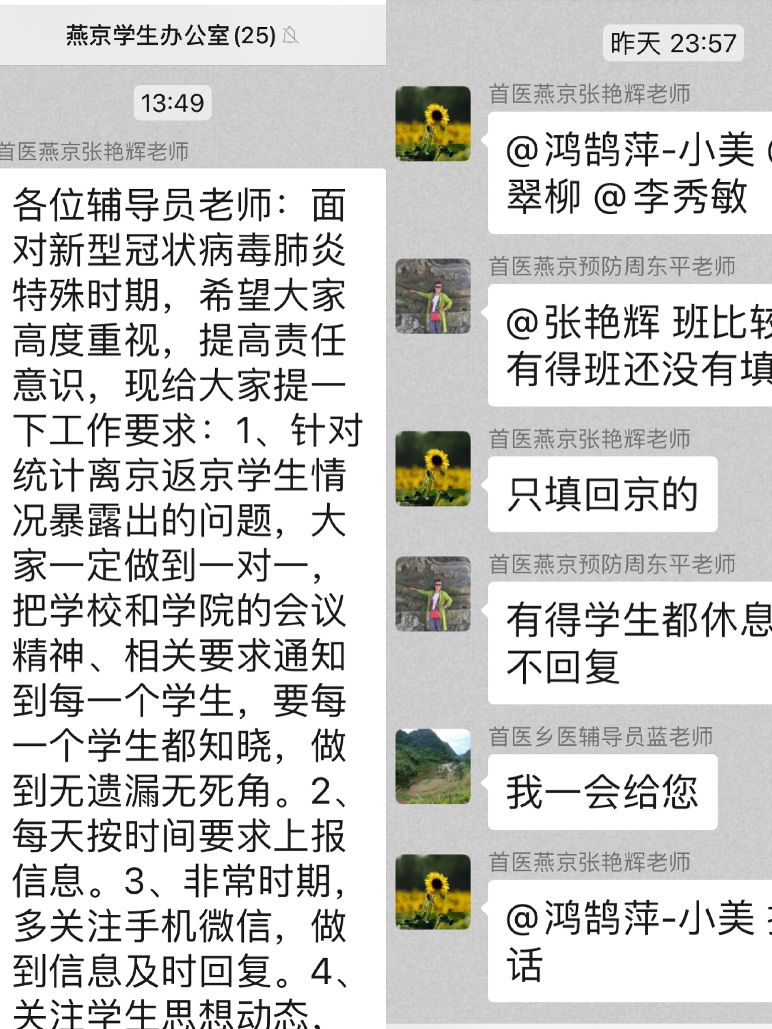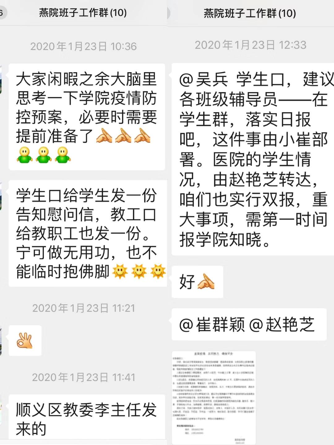 1月23日,上海麻将 班子成员第一时间启动疫情防控专题工作,建立了全覆盖的工作体系。第一时间向全院师生员工发布了《直面疫情、共同努力、确保安全》、《上海麻将 开学返京有关工作预案思考》等一系列及时准确、暖心贴心的提示和通知;第一时间决定并落实上海麻将 门诊楼做应急隔离房;第一时间建立燕京医上海麻将 寒假疫情防控工作机制并成立领导小组,上海麻将 党委书记吴兵、院长杨红担任组长,并设立了9个工作小组,负责教职工日报、学生日报、顺义区教委对接、卫生健康应急、安全保卫、后勤保障、应急物资采购、教学协调、宣传工作等工作;第一时间建立信息日报、零报告制度,完成了对所有教职工,尤其是湖北籍教职工(及其配偶、亲属)及近期有湖北行程往返师生情况摸排,落实“一对一”联系机制,跟进了解情况。