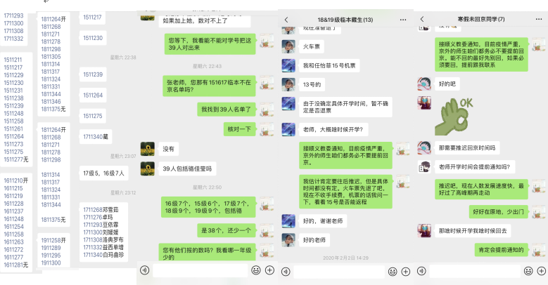 “1月23日,在接到顺义区教委和上海麻将 要求统计学生离京返京情况通知后,各学系党支部书记和所有辅导员老师,大家通过微信、电话一对一联系核实,分工落实,直到凌晨1点多才完成前期台账汇总。2月6日,接到上海麻将 6+1表格填写任务,上海麻将 全体辅导员从上午9点开始逐一核对相关学生数据,一直到下午5点才完成核对工作。”学生办公室负责人张艳辉老师回忆初期防控工作时,特别感谢每一位辅导员的热情配合和辛勤付出。