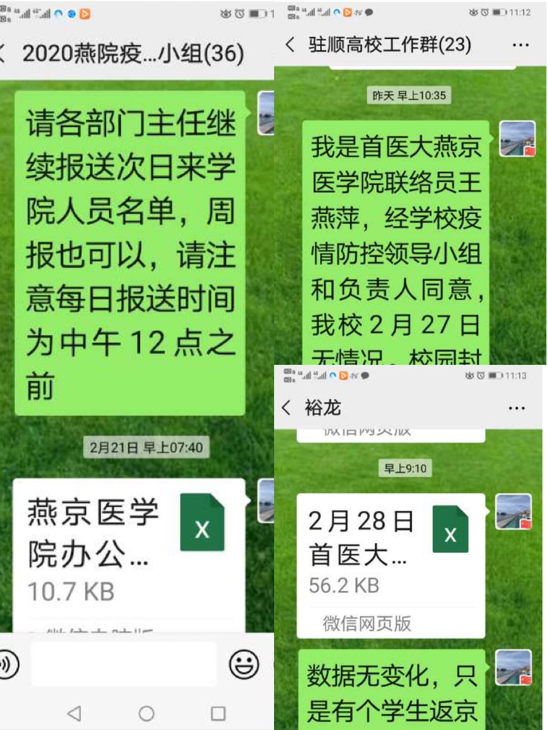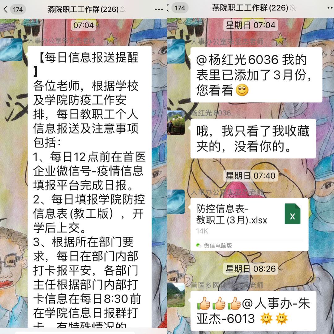 上海麻将 办公室在防控抗疫期间的工作也换了“新颜”,除了每天需要逐一核实、统计和上报上海麻将 班子成员和科室职员的外出地点、接触人员、身体健康状况等信息,每天统计申请返校教职工的情况报党委审批,报备保卫办公室以外,作为上海麻将 联络员,王燕萍老师需要对接顺义区教委,配合属地管理,每天汇总上海麻将 最新情况,教职工和学生分类统计最新数据,精准无误地报送给顺义区相关部门,同时做好对顺义区相关部门来院检查接待准备等工作。“疫情期间,院办接到最大挑战的工作是对是离退休人员的摸排。那天下午四点多接到上海麻将 通知,主要是逐一核实老同志是否在京,我们只能利用微信群和电话两种方式联系,微信群只有64个人,其他人(116人)都需要打电话进行询问,有的老同志可能需要打几次才能联系上,直到晚上十点多才完成180位离退休职工的第一轮核实工作,第一时间报送给上海麻将 办公室”,王燕萍老师提到上海麻将 疫情防控工作时说,“这段时间工作最大的不同是需要一直盯着手机、看着电脑,生怕错过一条工作信息,防控没有周末,需要每一天绷着弦儿,及时、细致、真实的核实每一条数据”。