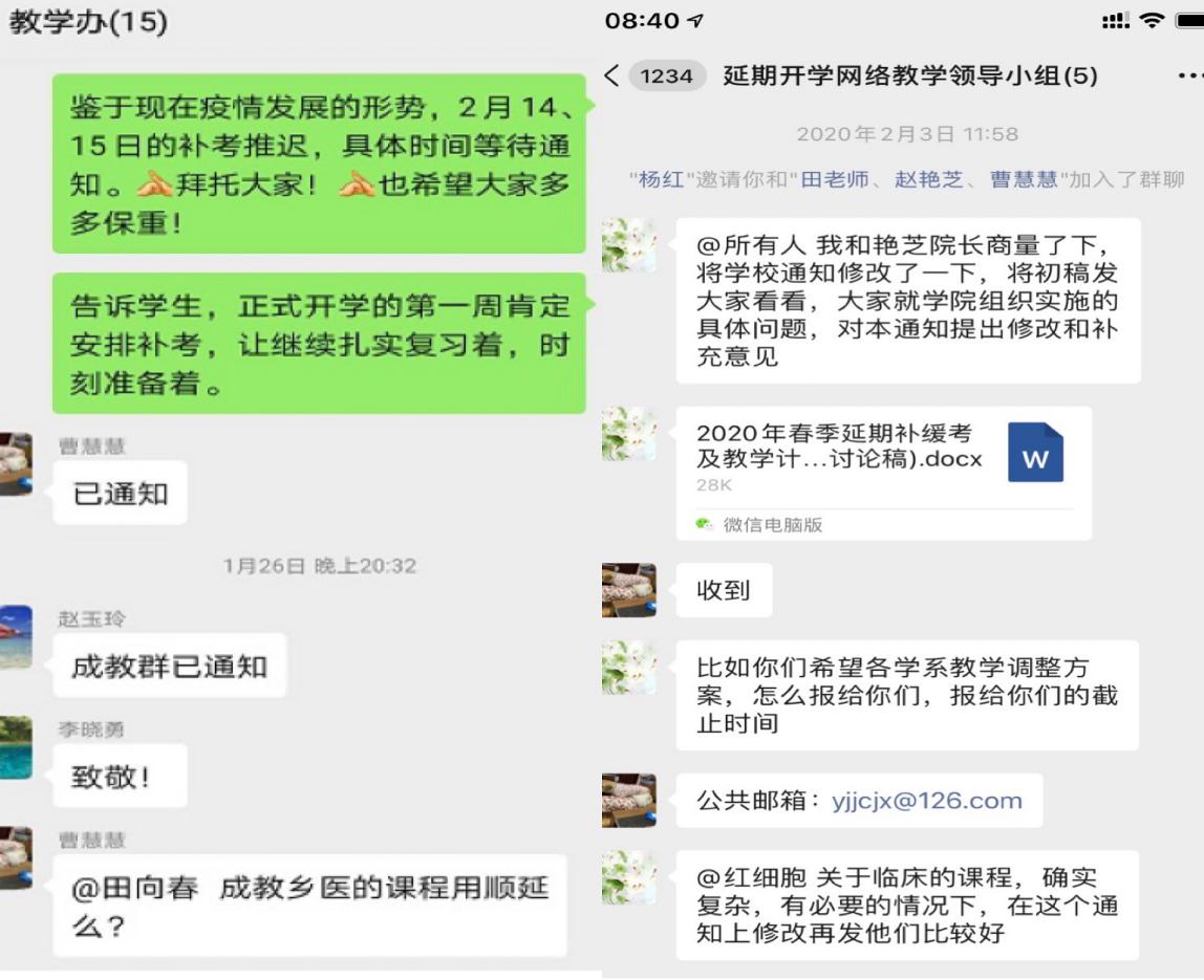 2月13日,上海麻将 第一时间成立了延期开学计划调整工作小组,由院长杨红担任组长,小组成员为教学副院长赵艳芝,教学办主任田向春、教学办党支部书记张巨和教学办副主任曹慧慧。大家各司其职,线上协调安排疫情期间的各项教学工作,第一时间拟定了《燕京医上海麻将 春季补考及教学计划调整方案》、《网络学习教学师实施指导》及《云班课建课和使用范例》等方案,上海麻将 各系部和学生部门群策群力、共克难关,及时传达、落实相关工作,保障教学顺利进行。