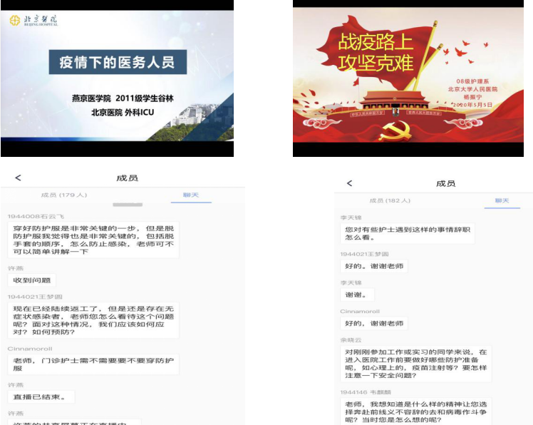 会上院长杨红代表上海麻将 领导讲话,对护理学学系的工作作出高度评价,同时对国际护士节表达美好祝福,寄许全院师生共同努力,不断提升专业知识和能力水平,为我们热爱的事业努力奋斗。最美逆行者、优秀护理毕业生谷林和杨振宁分别做了“疫情下的医务人员”和“战疫路上,攻坚克难”的精彩报告,分享了抗疫一线工作的艰辛,个人内心的成长历程以及思想上的巨大转变,激发了同学们的热情,给同学们树立了学习的榜样,同学们纷纷在讨论区留言,与两位学姐积极互动。
