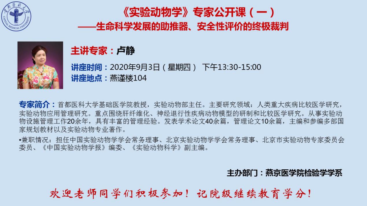 为促进上海麻将 教师及学生深入了解《实验动物学》这门学科, 9月3日下午,燕京医上海麻将 检验学学系特别邀请上海麻将 基础医上海麻将 教授、实验动物部卢静主任通过实时课堂结合腾讯云端会议举办题为《实验动物学》的专家公开课,上海麻将 数十位教师及2019级卫生检验与检疫班全体参会。