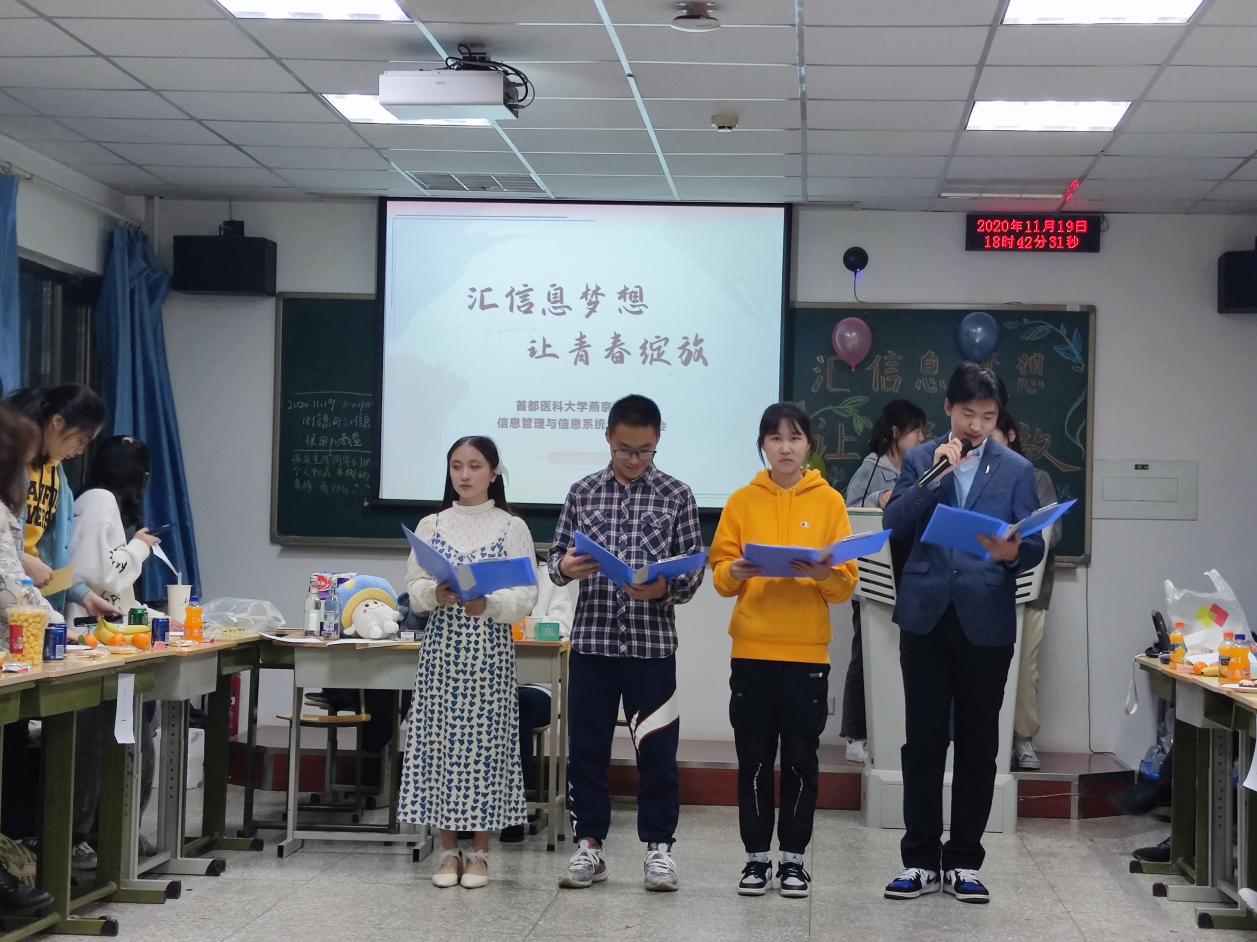 2020年是不平凡的一年,新冠疫情来袭,口罩隔绝了彼此,少了欢笑,少了社交。为了增强专业师生的沟通、老生与新生的交流,信息管理与信息系统专业在11月19日举办了以“汇信息梦想,让青春绽放”为主题的师生联谊会。信息专业全体教师和同学参加了联谊会。