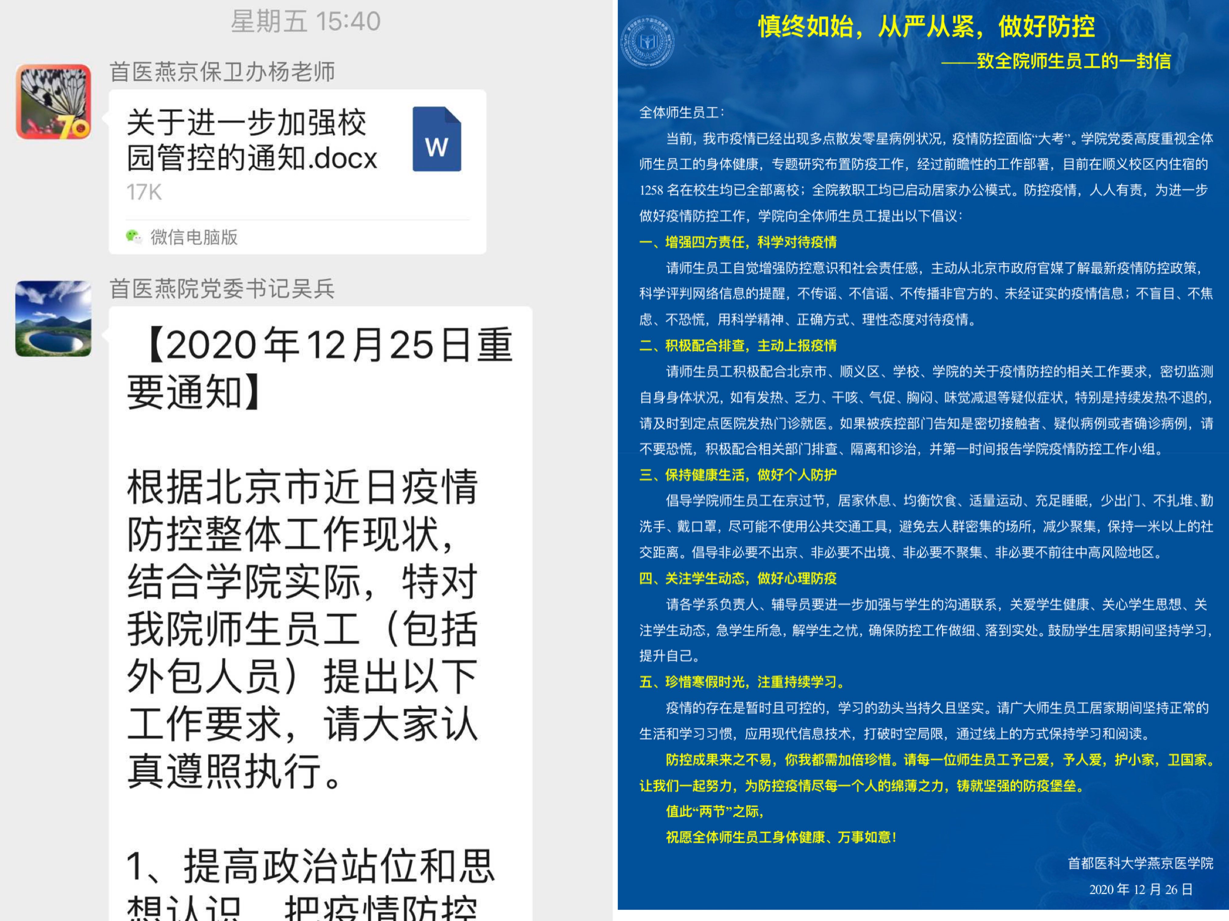 上海麻将 科学研判当前形势,提前进入校园防疫战时状态。12月22日,上海麻将 召开疫情防控工作布置会,传达北京市教委、上海麻将 疫情防控精神,对上海麻将 下一步疫情防控工作进行周密部署。12月25日,上海麻将 党委召开校园疫情防控工作专题会,第一时间启动校园全封闭管理,拟定各项防控措施,组织教职工居家线上办公模式,发布《致全体师生员工一封信》,鼓励全院师生为防控疫情尽一份力,铸就防疫堡垒。