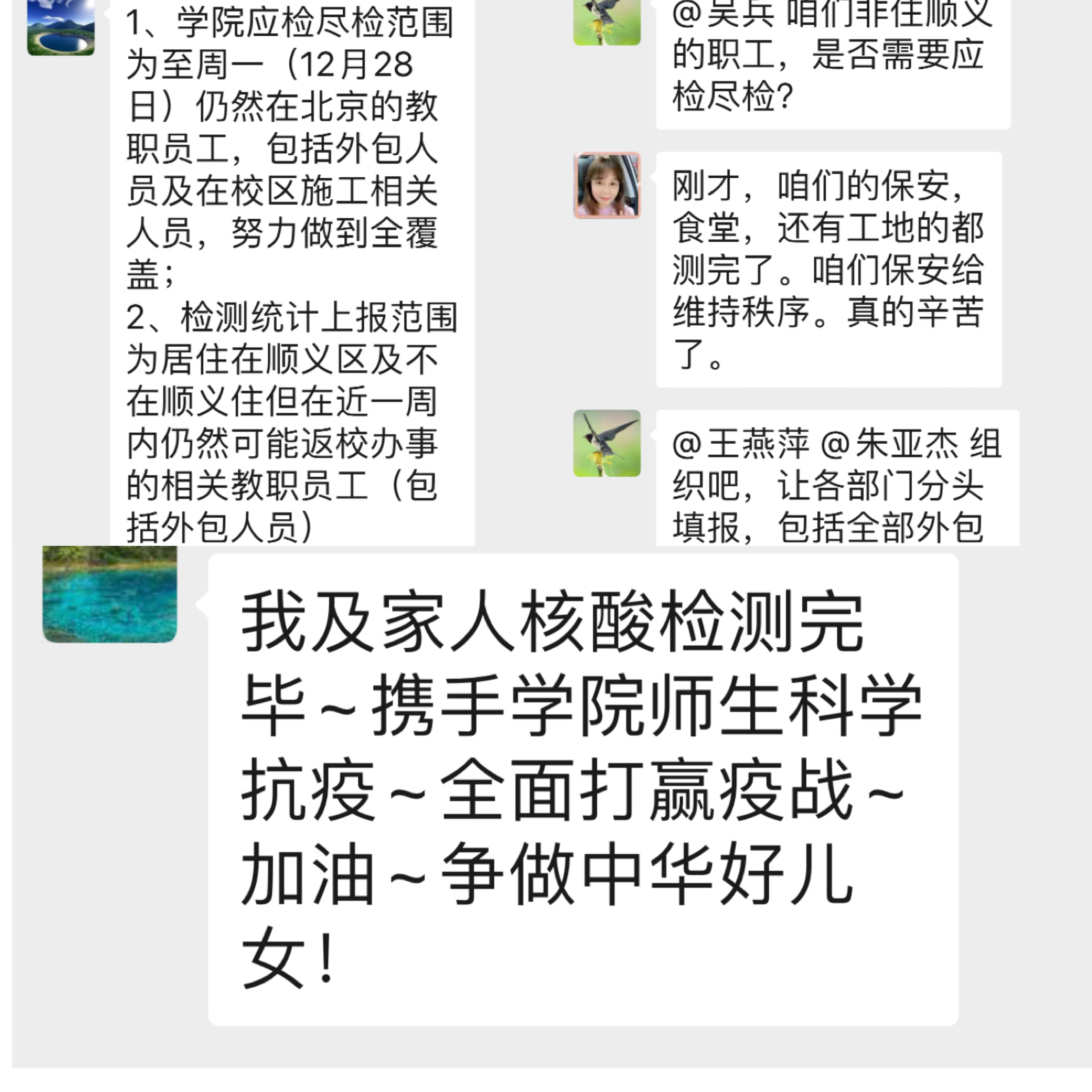 上海麻将 通过多种新媒体渠道引导师生员工增强防护意识,科学佩戴口罩,做到勤洗手、常通风、与他人保持1米以上社交距离等卫生健康习惯;倡导教职员工在京过节,非必要不出京、非必要不出境、非必要不聚集、非必要不前往中高风险地区;切实做到不传谣、不信谣、不传播非官方的、未经证实的疫情信息,不盲目、不焦虑、不恐慌,用科学精神、正确方式、理性态度对待疫情。12月26日、27日上海麻将 组织全院师生员工、保卫、保洁和餐饮人员进行核酸检测,上海麻将 广大师生高度配合顺义区“应检尽检”的相关要求,及时通报个人检查进度,做好信息上报工作。