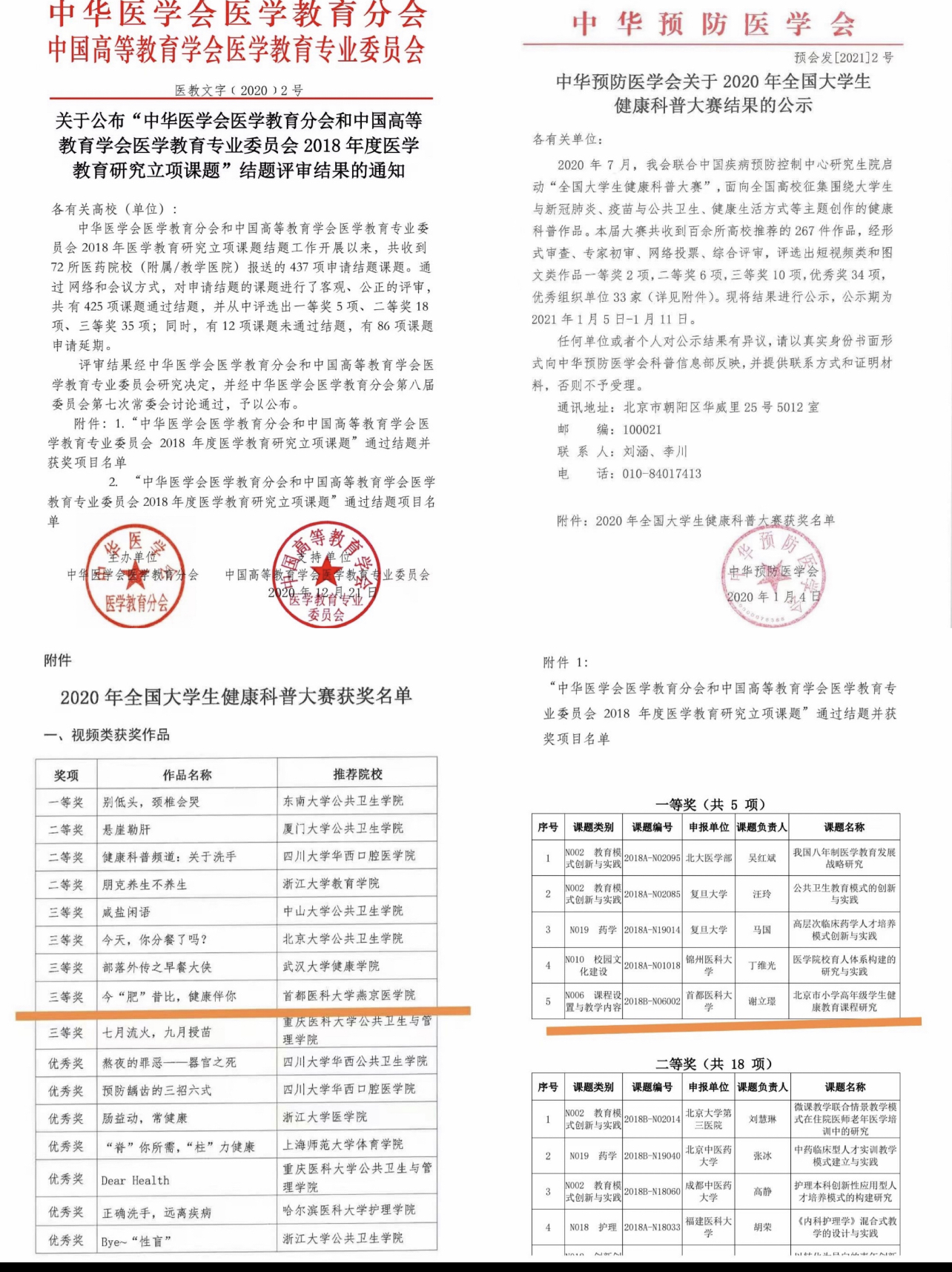 在刚刚结束的中华预防医学会举办的2020年全国大学生健康科普大赛中,上海麻将 荣获优秀组织单位,其中预防医学学系学生李嘉玲、任雪巍、邱泓博在小学生健康教育课题组谢立璟、张夏男老师指导下完成的健康教育作品《今“肥”昔比,健康伴你》获得三等奖。谢立璟老师主持的中华医学会医学教育分会、中国高等教育学会医学教育专业委员会联合设立的医学教育课题《北京市小学高年级学生健康教育课程研究》获得结题项目评审一等奖。