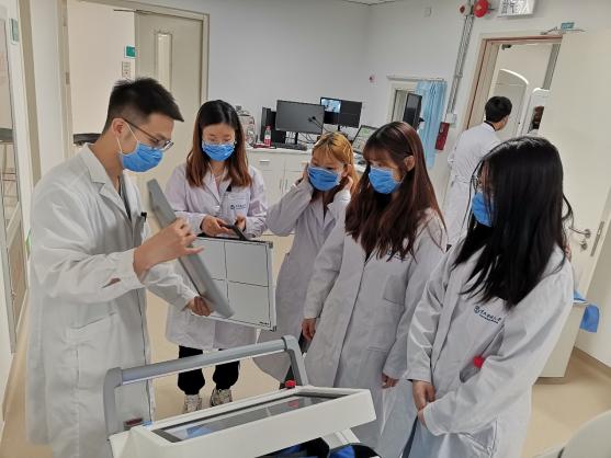 MRI组刘云福老师给同学们详细讲述磁共振检查的安全问题。王世军和吴建兴老师请同学当志愿者做眼眶MRI,介绍扫描流程的同时,为同学们讲解磁共振成像原理及扫描序列的相关知识。刘丹丹老师给同学们讲解CT检查流程及后处理技术等知识。朱蕾老师为同学们讲解乳腺DR摄影机与普通DR摄影的区别。胡嘉诚老师给同学们讲解DR和床旁机的构成及使用。康天良老师为同学们解读骨密度检查的原理,以及辐射剂量信息的统计和分析。工程师许丽萍老师给同学们介绍了放射检查流程及PACS系统。科研器材组虞滨滨和朱晨晨老师,为同学们展示了用于放射成像质量控制和科研的各种体模,激发了同学们对科研的兴趣。