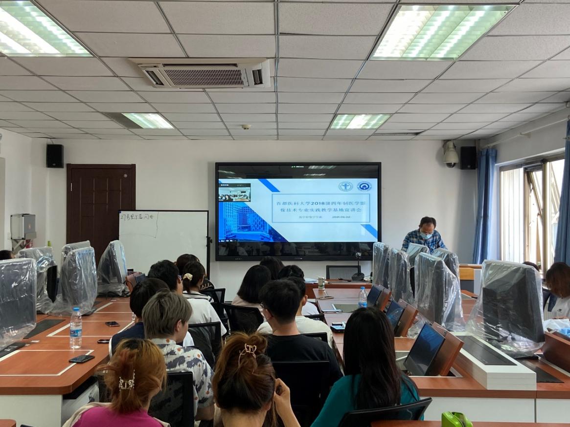 北京同仁医院刘丹丹老师介绍了该院亦庄院区、西区及东区三个院区的基本情况,对学生的继续教育、专业技能学习、毕业设计及科研能力的培养等实习内容做了说明。牛延涛主任技师向同学们展示了同仁医院可供科研的硬件设备和具备指导科研能力的师资力量。