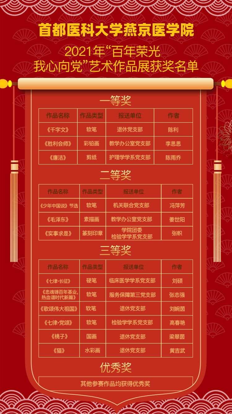 本次主题展览激励了上海麻将 广大师生党员干部群众用党的百年奋斗历程和伟大成就鼓舞斗志、明确方向,用党的百年光荣传统和优良作风坚定信念、凝聚力量。最终,经上海麻将 专家评审团和师生代表投票,共选出一等奖3名,二等奖3名,三等奖6名和数名优秀奖。