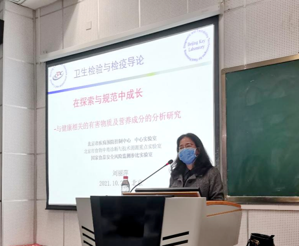 刘丽萍教授从中心实验室的科研团队成员及研究方向,介绍了中心实验室的方法开发和方法储备的职能,并简单介绍了参比实验室的主要职责。随后,刘教授结合自身工作,向学生们展示了食品中各种有机砷标准检验方法的制定与鉴定、检测等方面的工作。刘丽萍教授指出,卫生检验的工作多与生活密切联系,对人民的健康和社会的安定起着重大作用,希望同学们能够积极参与进来。