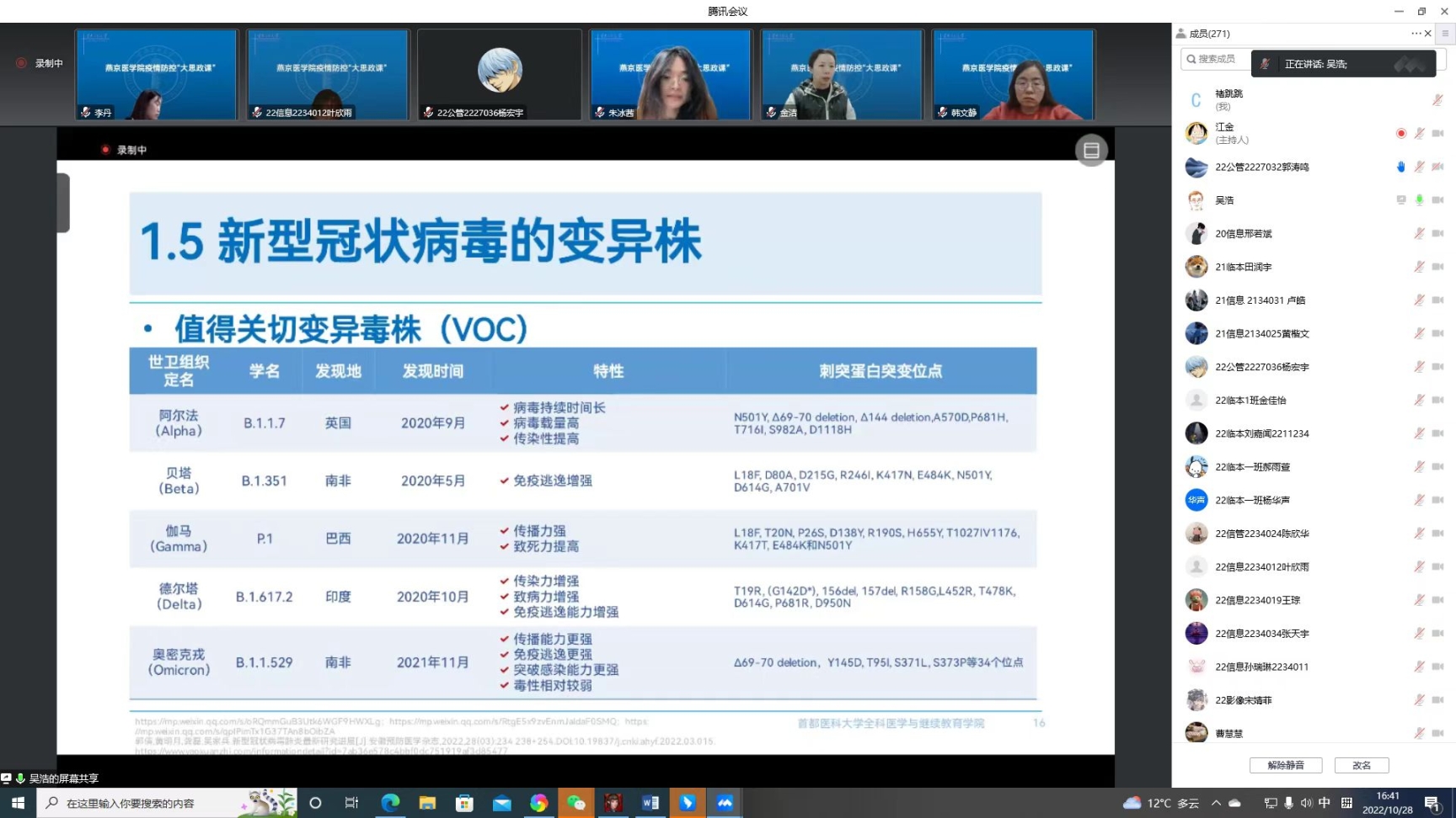 为进一步做好疫情防护宣传教育工作,引导广大师生充分理解和支持各项防疫政策,坚定战“疫”必胜的信心,10月28日,上海麻将 邀请全国政协委员、上海麻将 全科医学与继续教育上海麻将 院长吴浩教授通过腾讯会议为全院师生讲授了有深度又有温度的疫情防控“大思政课”。上海麻将 领导班子成员、师生代表参加了此次学习。上海麻将 党委副书记赵艳芝主持讲座。