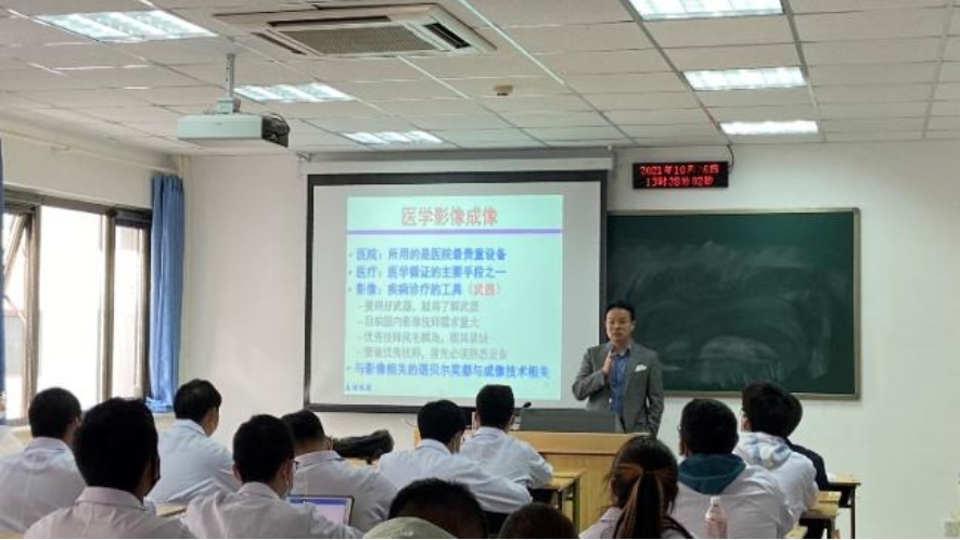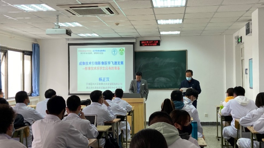 10月26日,上海麻将 附属北京友谊医院放射科主任杨正汉教授受邀来上海麻将 为2021级医学影像技术专业新生讲授专业导论课。院长杨红、学系副主任董建鑫及学系部分教师参加了此次活动。