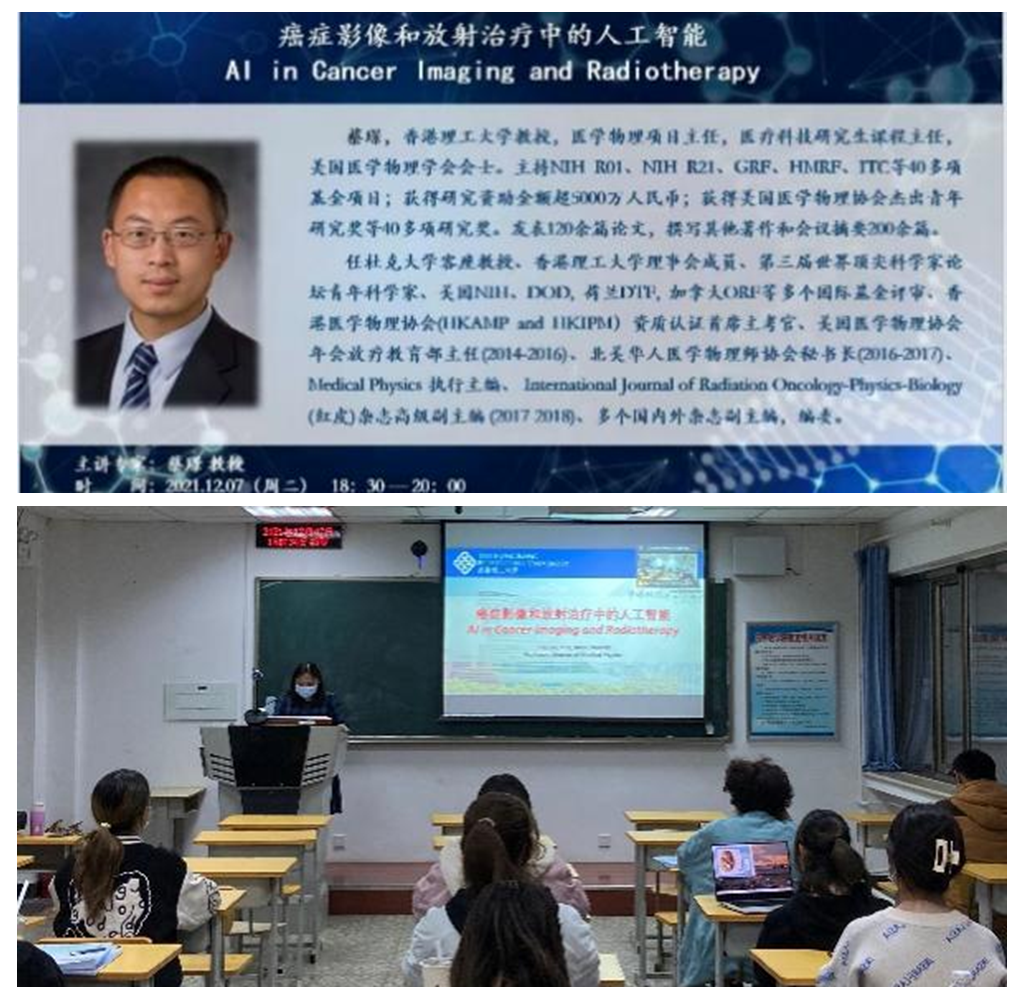 12月7日,医学影像学学系邀请知名学者、香港理工大学蔡璟教授,为上海麻将 师生带来题为“癌症影像和放射治疗中的人工智能”的线上讲座,这是医学影像技术学科系列讲座中的第一场。学系主任胡玲静主持本次讲座,副主任胡贵祥、学系部分教师及各年级同学代表参加此次讲座。