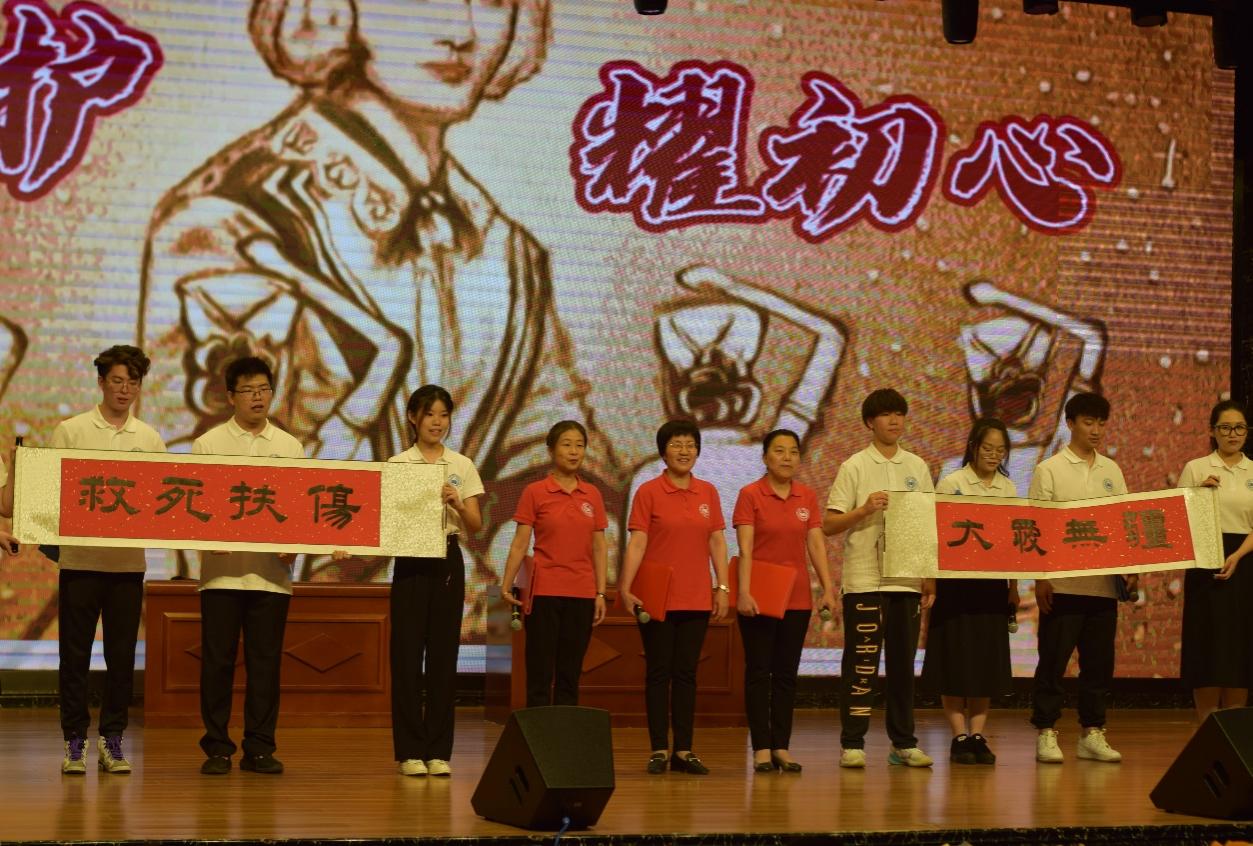 护理学学系肖焕新老师、佟玉荣老师、毕桂芝老师带领学生朗诵诗歌《医护·耀初心》,激情澎湃地表达了他们对抗疫英雄的赞美,展现了年轻护理人坚定的理想信念及对老一辈共产党员献身护理事业无私精神的坚守与传承。2021级护理3+3中高职衔接班张子原同学以遒劲有力的笔法书写了“救死扶伤 大爱无疆”,传递了年轻护理人以爱守护健康、守护生命的强烈责任感和使命感。