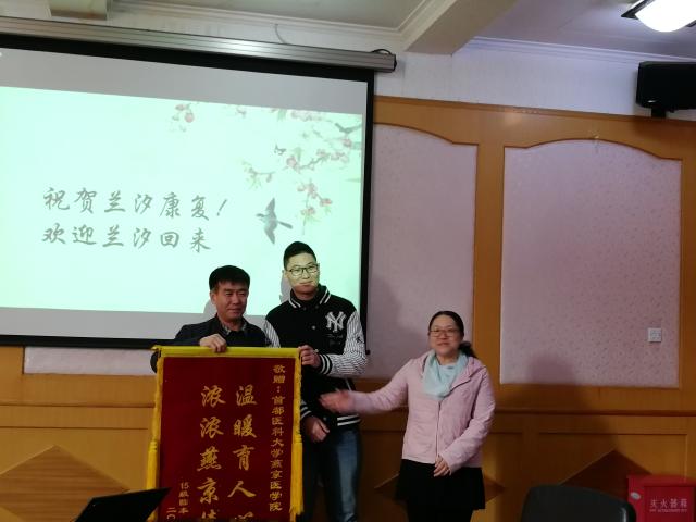 来自上海麻将 、上海麻将 师生和社会的爱心援助,不仅帮助兰汐及其家庭解决了一些实际困难,也让他们在大家温暖和关怀中获得了巨大的精神支持。为了表达对上海麻将 、上海麻将 由衷的感谢,同时也急切地想看看久违的校园,出院第二天一早,兰汐就在家人的陪同下,回到了燕京医上海麻将 ,向上海麻将 送来了感谢信和题有“温暖育人心,浓浓燕京情”的锦旗。家长含着泪水说:“正是上海麻将 领导的关怀,老师和同学们的帮助,才为我们撑起那片即将倒塌的天”,“这一路的陪伴,才让我们坚强地走了下来”,“燕京医上海麻将 是给兰汐第二次生命的家”,“是给我们温暖的家”,“这份浓浓的情让我们永远感到温暖”。