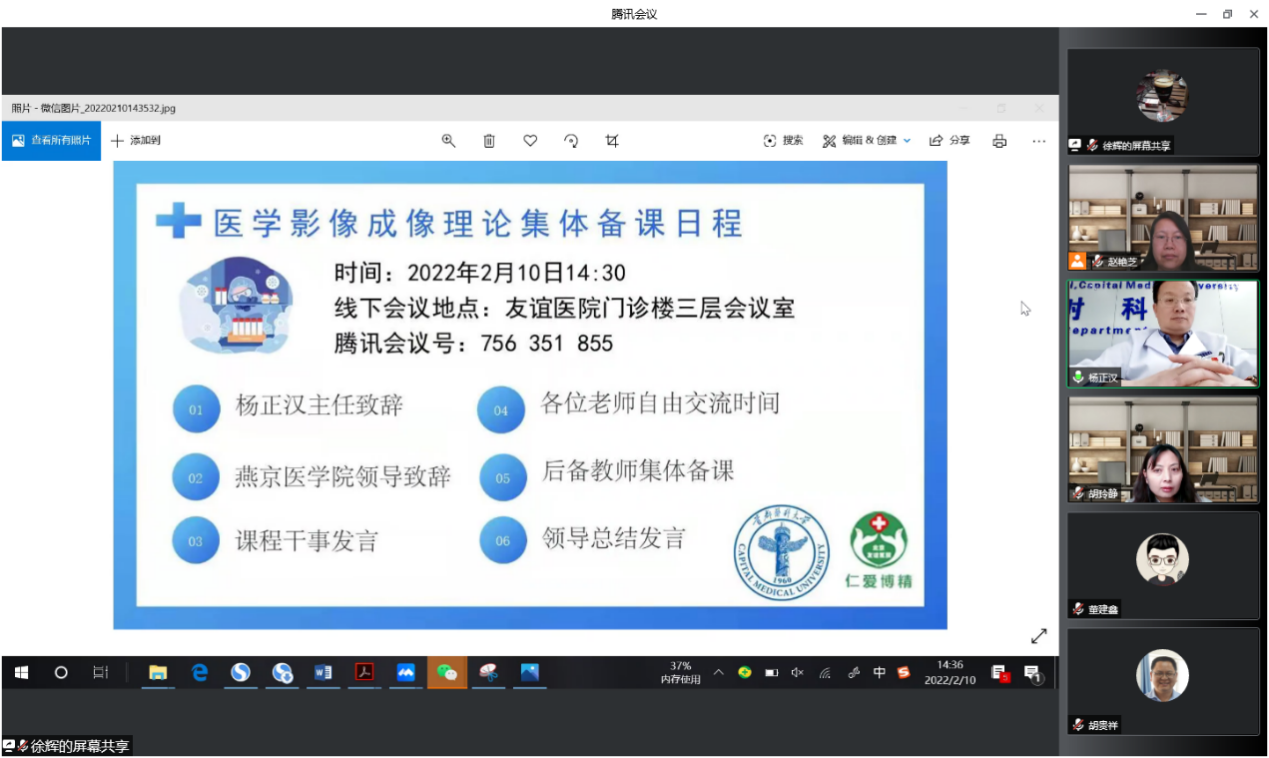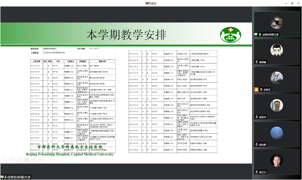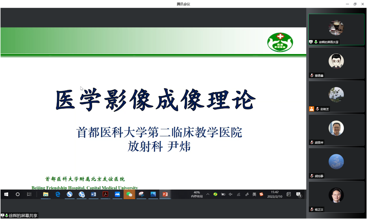 2月10日,医学影像学学系医学影像成像理论课程组通过线上、线下相结合的方式,召开新教师试讲暨基础临床联合集体备课会议。上海麻将 党委副书记赵艳芝、医学影像学学系主任胡玲静、副主任董建鑫和胡贵祥以及上海麻将 附属北京友谊医院放射科主任、医学影像技术专业医学影像成像理论课程组组长杨正汉教授及课程组部分教师参加了此次会议,会议由课程组干事江桂莲老师主持。