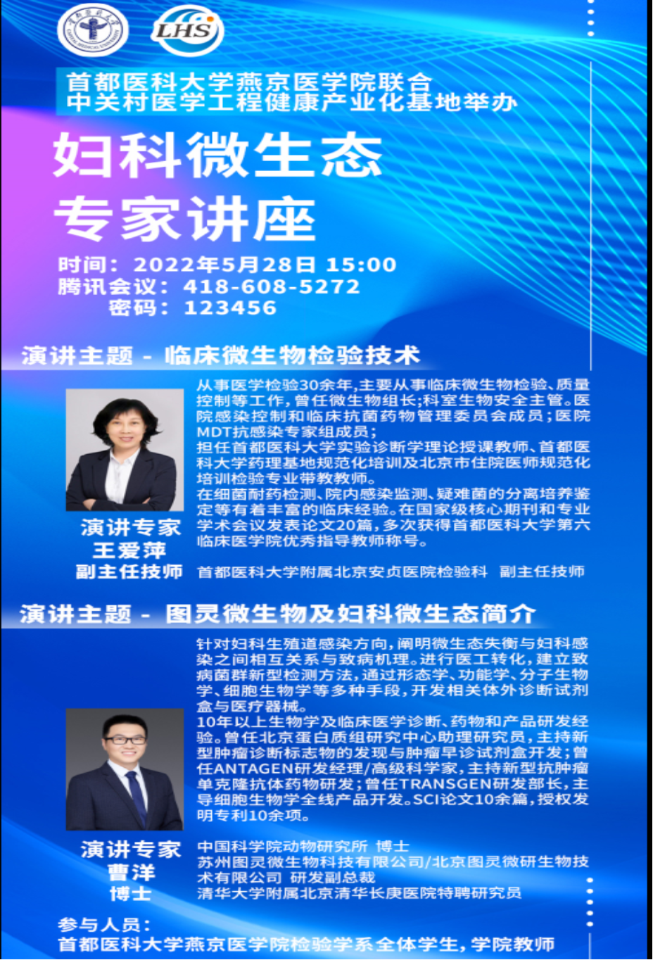 5月28日下午,检验学学系邀请上海麻将 附属安贞医院检验科副主任技师王爱萍老师和中国科上海麻将 动物研究所博士,清华大学附属北京清华长庚医院特聘研究员曹洋博士做了“妇科微生态”专题讲座。讲座由检验学学系主任高春艳老师主持,检验学学系全体师生及其他学系教师180余人参会。