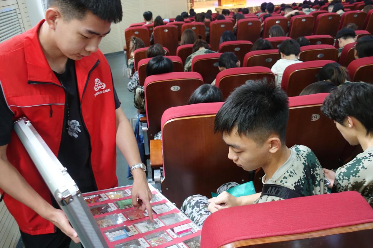 在禁毒宣传教育过程中,顺义区光明街道的社工人员给同学们发放了禁毒宣传教育手册,并展示了仿真毒品的实物模型。