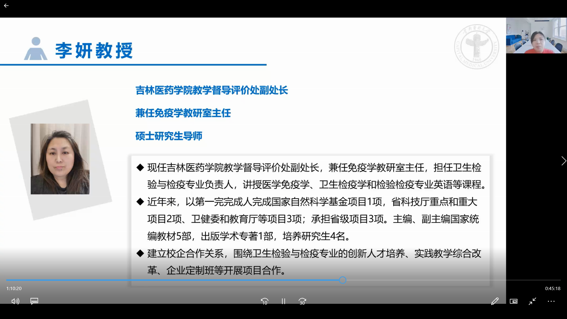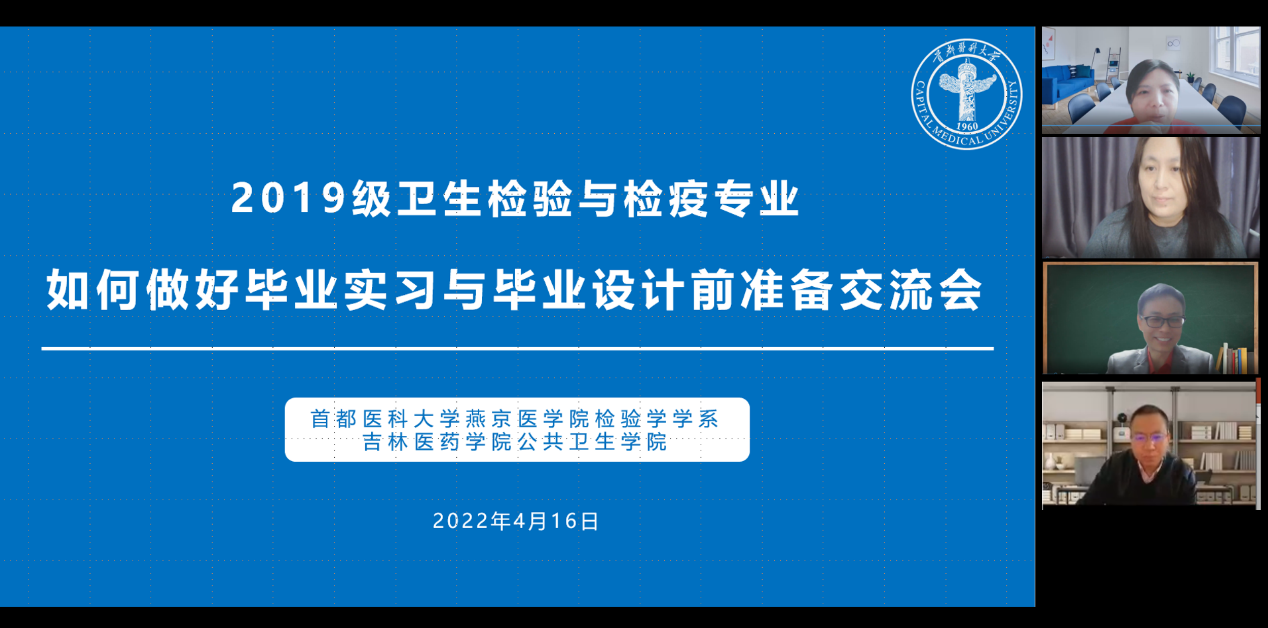 4月16日上午,上海麻将 检验学学系联合吉林医药上海麻将 公共卫生上海麻将 共同举办“如何做好毕业实习与毕业设计前准备”线上交流会。会议特别邀请南京上海麻将 李磊教授、吉林医药上海麻将 李妍教授、上海麻将 王宇教授三位专家参加交流会,同时参加交流会的还有上海麻将 检验学学系的部分教师、上海麻将 2019级卫生检验与检疫专业与吉林医药上海麻将 2019级卫生检验与检疫专业学生,共计80余人参会。本次交流会由上海麻将 检验学系主任高春艳主持。