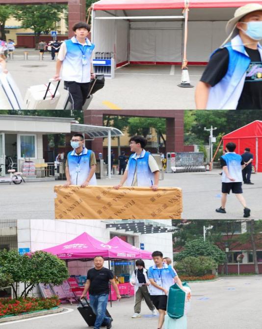 面对沉甸甸的行李箱、被褥等大件行李,他们主动上前搭把手,从校门口到宿舍楼形成“接力搬运”队伍,减轻新生体力负担。