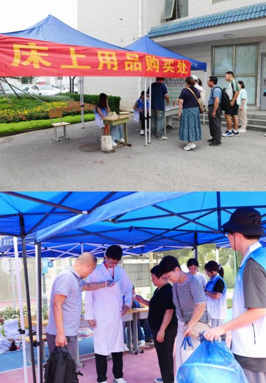 在白大衣与床上用品售卖点,志愿者维持秩序、引导登记,确保物资发放高效有序;抵达宿舍楼下,他们还协助办理住宿手续、帮忙整理行李、介绍宿舍设施,用行动化解新生初来乍到的陌生感与局促感。