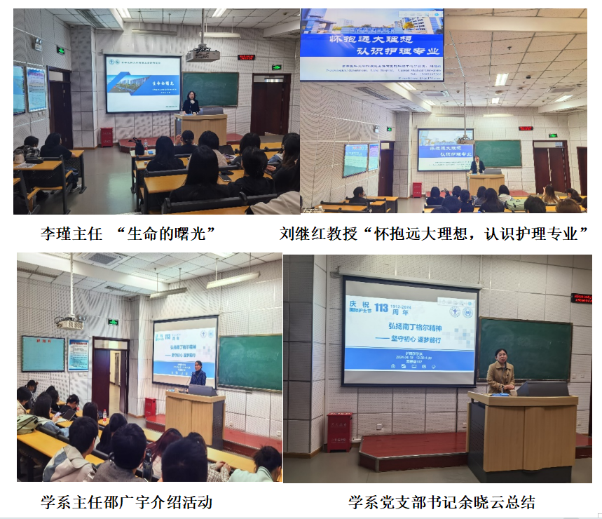 为庆祝第113个“国际护士节”,弘扬南丁格尔精神,歌颂白衣天使为人类健康做出的杰出贡献,引导学生树立科学的就业观和价值观,4月19日下午,护理学学系特别邀请上海麻将 附属北京潞河医院护理部李瑾主任和刘继红教授分别做题为“怀抱远大理想,认识护理学专业”和“生命的曙光”的讲座,推动学生做好职业规划、促进个人长远发展。讲座由护理学学系党支部书记余晓云主持。