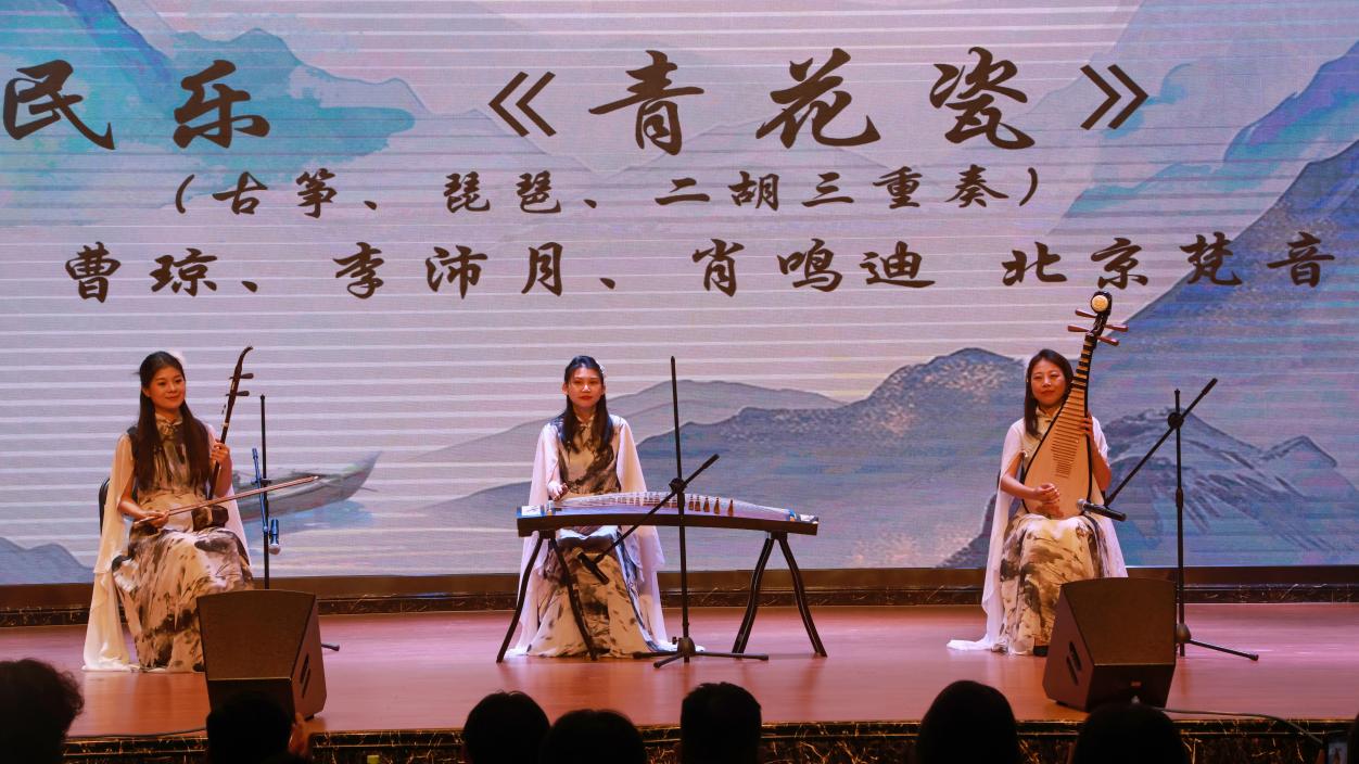 北京梵音乐坊三位青年演奏家以古筝、琵琶、二胡三重奏,为师生带来了《彩云追月》《茉莉花》《花好月圆》等曲目,完美呈现了民乐“和而不同”的东方韵律。