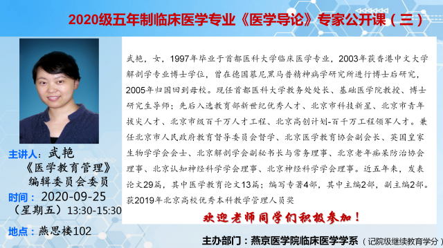 武艳教授"医学导论"公开课(三)的通知